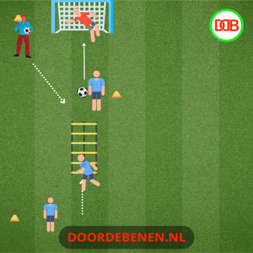 Deze oefening is ideaal voor het verbeteren van uithoudingsvermogen, snelheid en focus in wedstrijdsituaties. Zet eerst een speedladder neer en laat elke speler knieheffen uitvoeren, waarbij elke voet twee keer in elk vak moet komen. Daarna leg je 8-10 horden neer in een rechte lijn. Spelers moeten over de horden sprinten en direct na de laatste horde een bal aannemen en afwerken. Elk gescoord doelpunt levert 1 punt op.